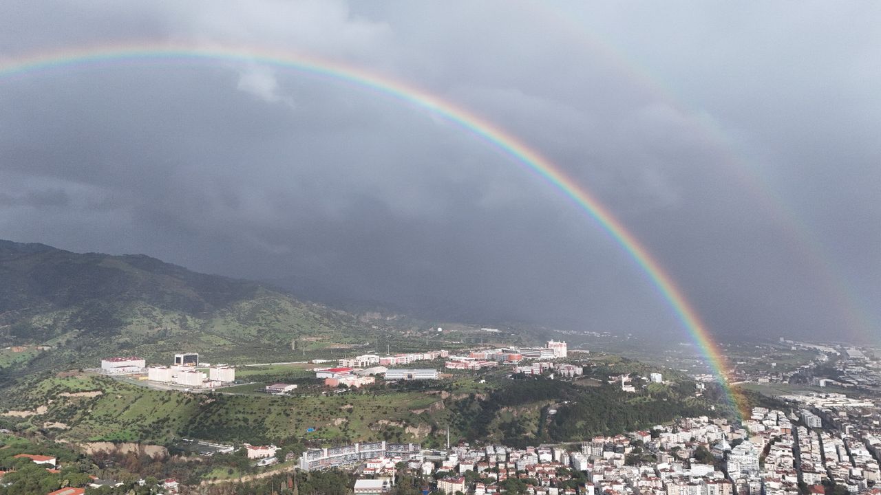 Bereketli toprakları yağmura doyan Aydın, yağış sonrası ortaya çıkan gökkuşağı görüntüsü ile mest etti. Sağanak sonrası bulutların arasından yüzünü gösteren güneşle birlikte şehri saran gökkuşağı ise izleyenleri etkiledi.